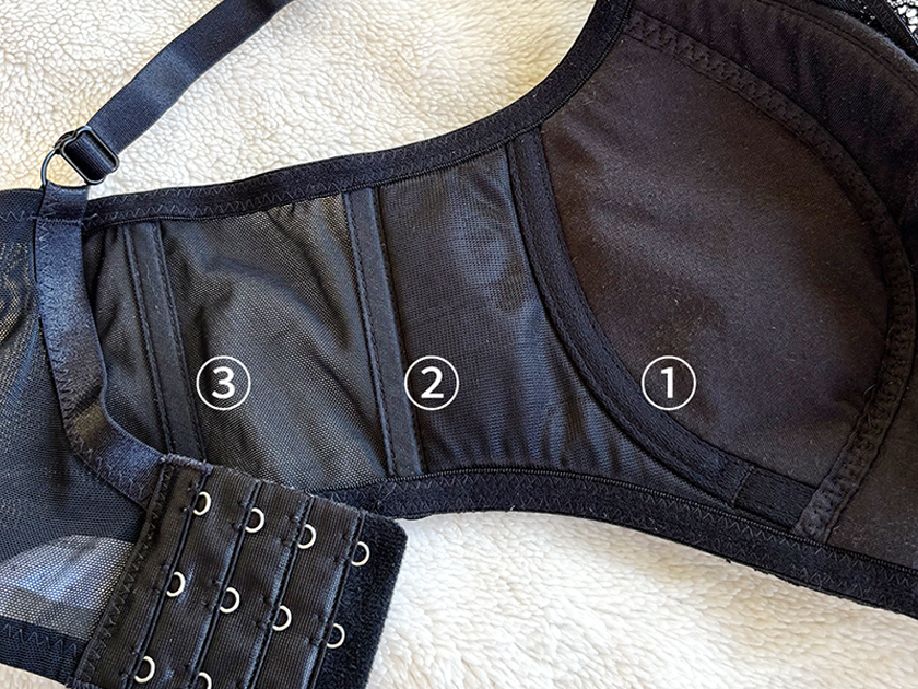 ②と③は、ワイヤーよりも柔らかいサイドボーンを使用しています。しっかりと支えてくれるパーツです。